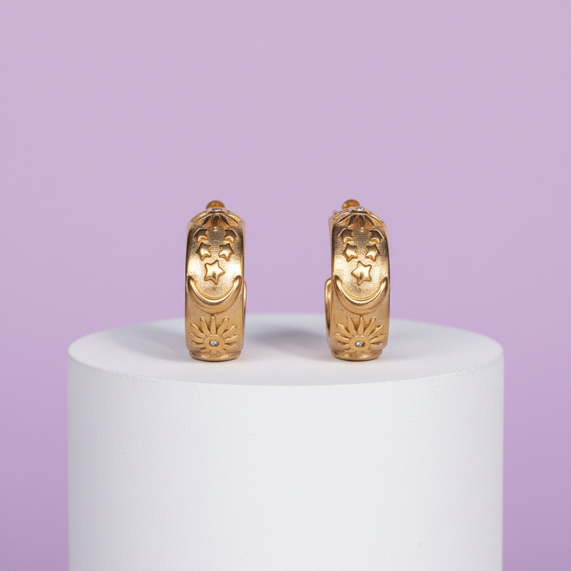 Meet the Lunasol Hoops from BAYANA Jewellery — radiant gold earrings adorned with sparkling zircon stones that catch the light with every movement. Their smooth, bold design blends elegance with everyday wearability, making them a versatile staple for any occasion. Crafted from durable stainless steel with 18ct PVD gold plating, these hoops offer long-lasting shine and are gentle on sensitive skin.