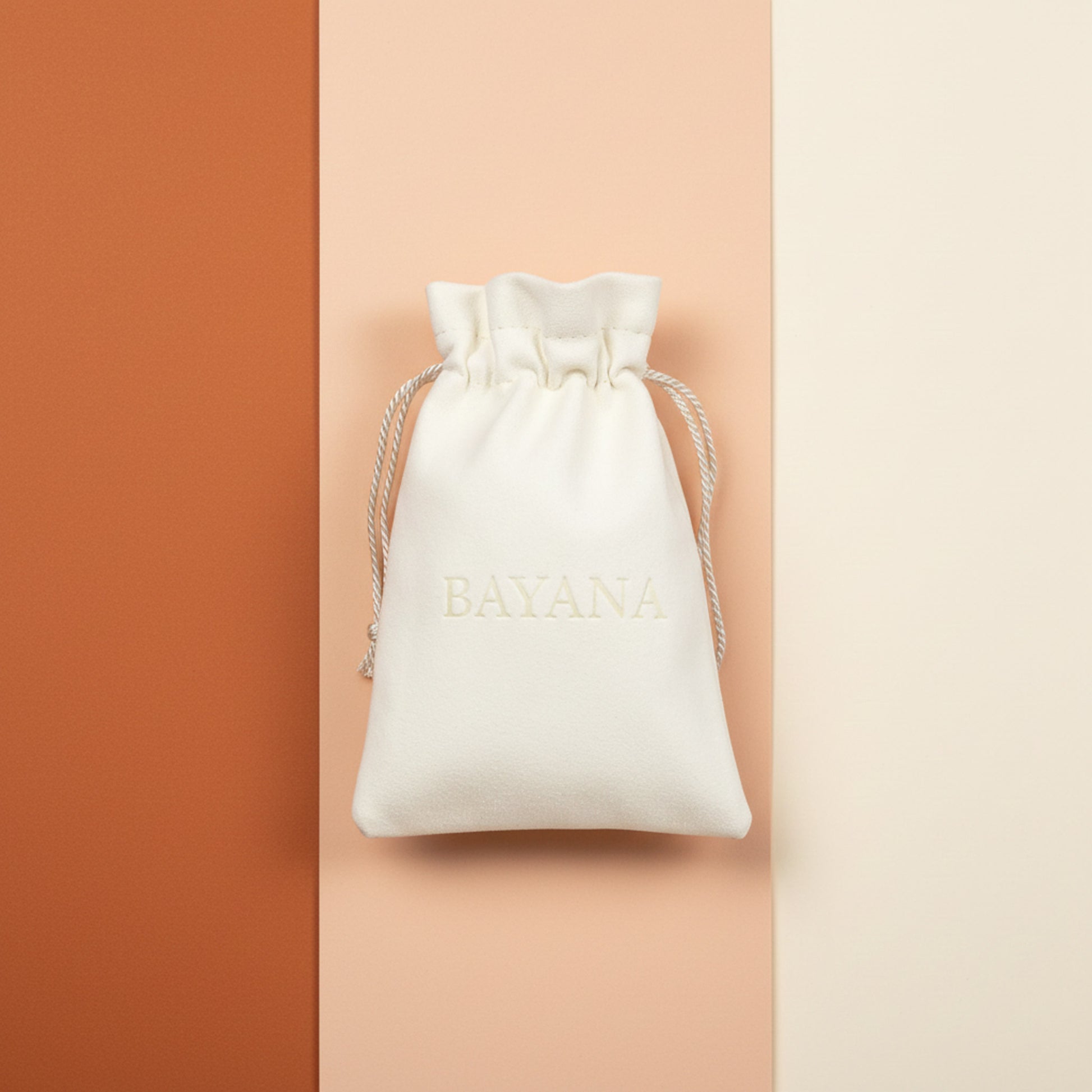 Each Bayana piece is thoughtfully presented in eco-friendly packaging. Every order will include at least one cotton or velvet drawstring pouch, designed to protect your jewellery while reducing waste. Our larger microfiber pouches (10 × 15 cm) are also available to purchase for $2 each if you would like extra storage, and luxury gift boxes can be added to make your present feel even more special.