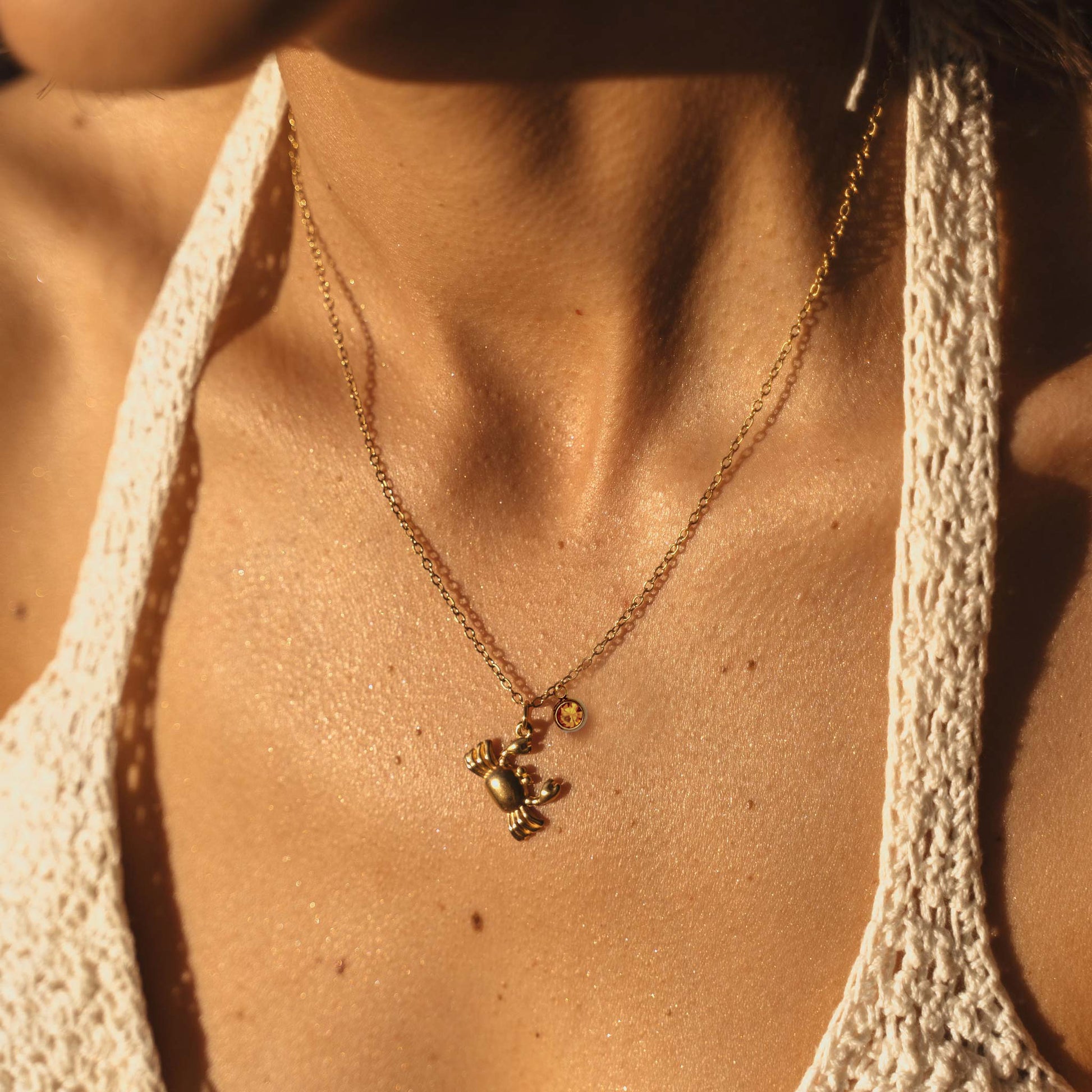 Introducing the Sebastian Necklace from BAYANA Jewellery — a playful yet refined gold crab necklace inspired by ocean life and coastal adventures. Featuring a delicately detailed 18k gold crab charm and a sparkling zircon stone, this piece embodies seaside charm with a touch of elegance.