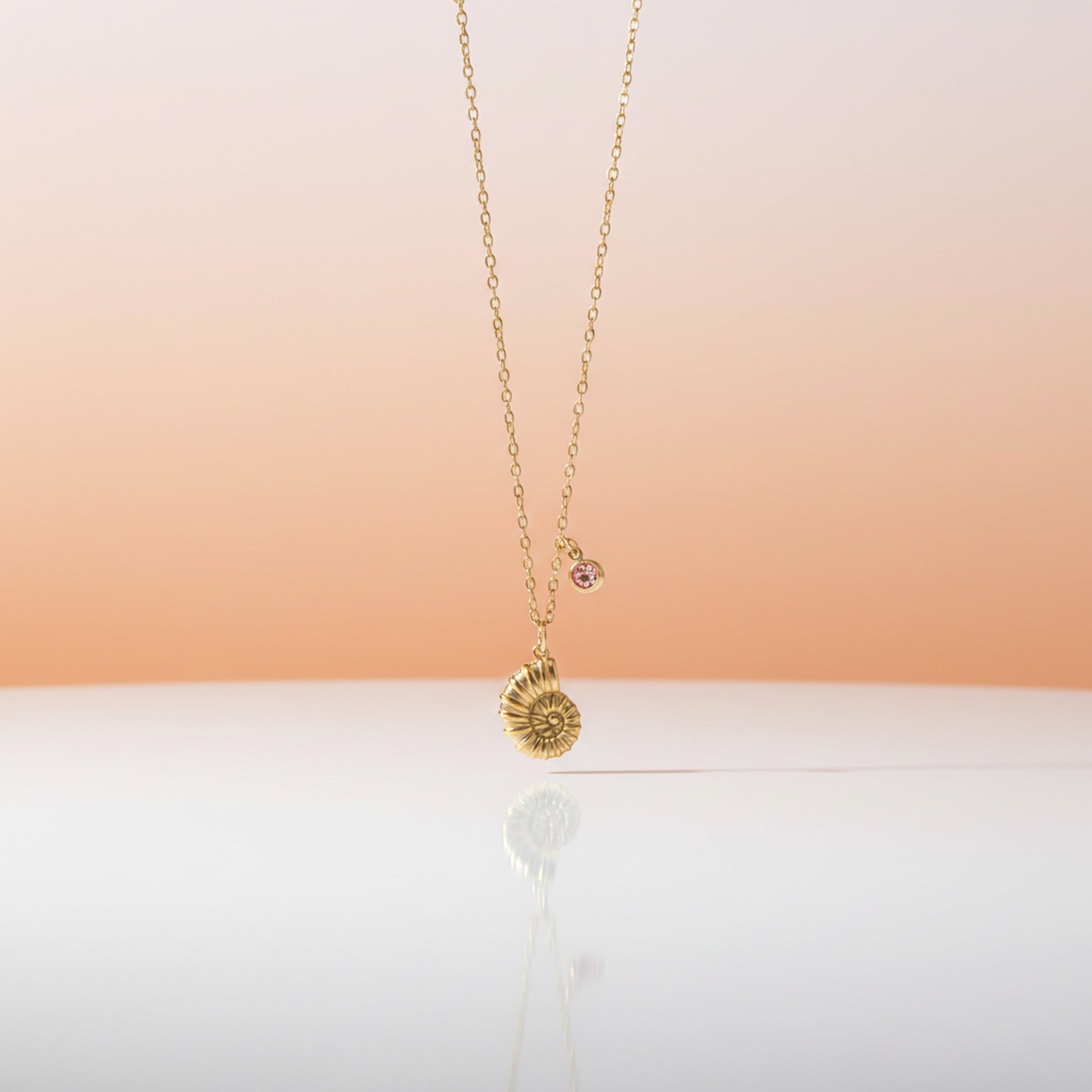 Meet the Sundial Necklace from BAYANA Jewellery — a delicate gold shell necklace inspired by sunlit shores and ocean reflections. This design features a beautifully sculpted 18k gold shell charm paired with a light-catching zircon stone, symbolising balance and calm.