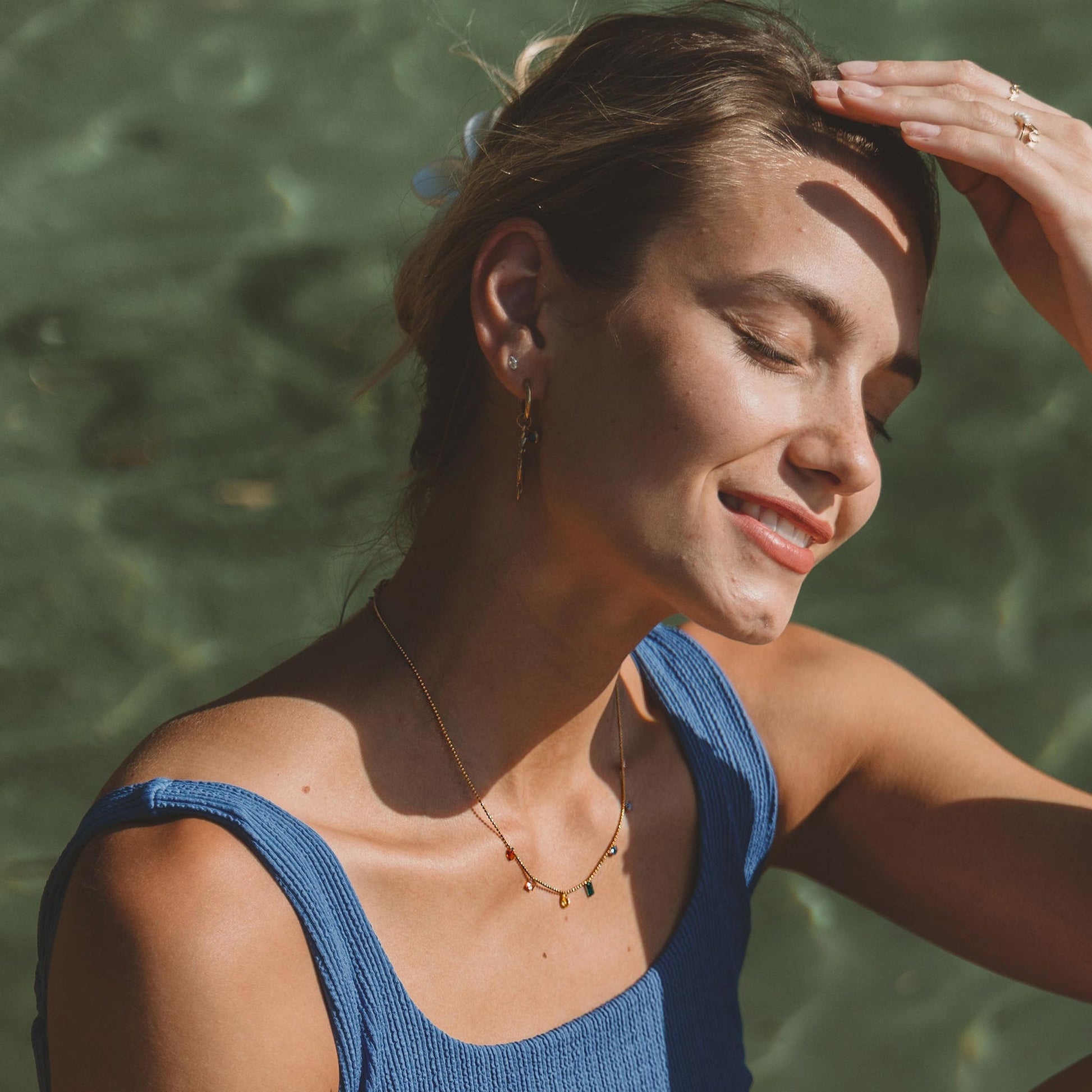 The Laguna Necklace is a delicate celebration of colour, light, and movement. Featuring a fine gold chain adorned with soft, multicoloured crystal accents, this piece captures the effortless beauty of sunlit waters and coastal tones.