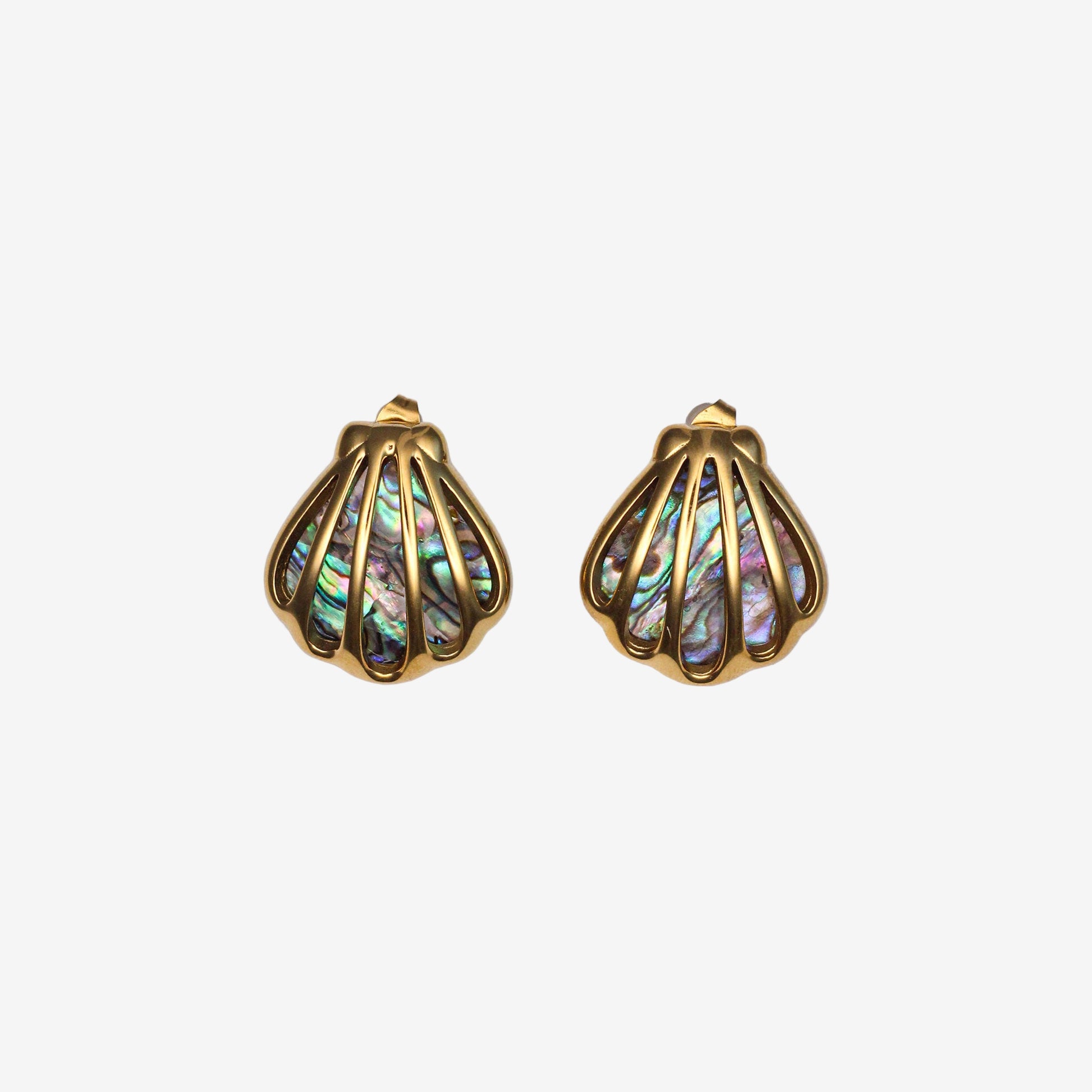 Elegant abalone shell earrings designed to mirror the colours of the ocean. Each 18k gold shell earring features natural abalone inlay with captivating turquoise, violet, and sea-green tones. Crafted from premium waterproof gold jewellery-grade stainless steel using PVD coating for long-lasting shine and durability.
